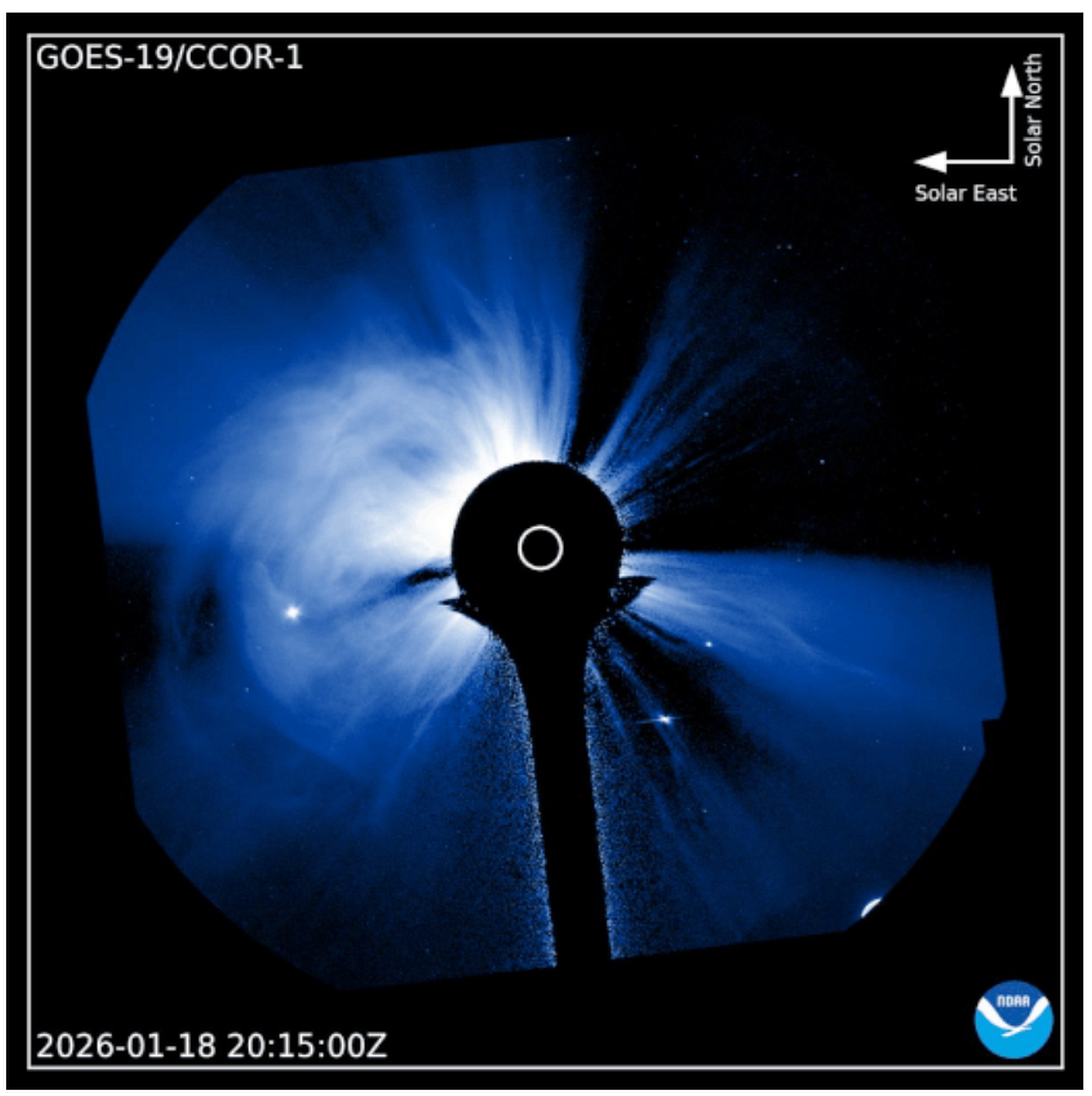 Der Stahnsdorfer Fotograf Mario Kacner war gerade am Sonntag von einer Polarlicht-Expedition nach Tromsø/ Norwegen zurückgekehrt, als er von dem aktuellen CME, einem koronalen Massenausbruch der Sonne, erfuhr. Normalerweise bewegen sich die geladenen Teilchen bei einem solchen Ereignis mit einer Geschwindigkeit von 500 bis 800 Kilometer pro Sekunde auf die Erde zu, diesmal wurden sie mit solcher Wucht aus der Sonne herausgeschleudert, dass sie sogar 1.660 km/s erreichten und damit schneller hier eintrafen als erwartet, nämlich schon nach einem Tag. Der schnellste jemals gemessene CME fand im Juli 2012 statt – damals mit bis zu 3.500 km/s – die Erde wurde jedoch (wohl glücklicherweise) von diesem Monster-CME knapp verfehlt. Seit 1995 werden Ausbrüche, die durch oberste Atmosphärenschicht (die Korona) austreten, von einer Raumsonde namens SOHO beobachtet. Bei den Aufnahmen wird der sichtbare Teil der Sonne abgedeckt, der sonst alles überstrahlen würde. Den jetzigen Ausbruch hat die Sonde so aufgenommen (die Teilchenstrahlen treten in mehrere Richtungen aus, die intensivsten in Richtung Erde):