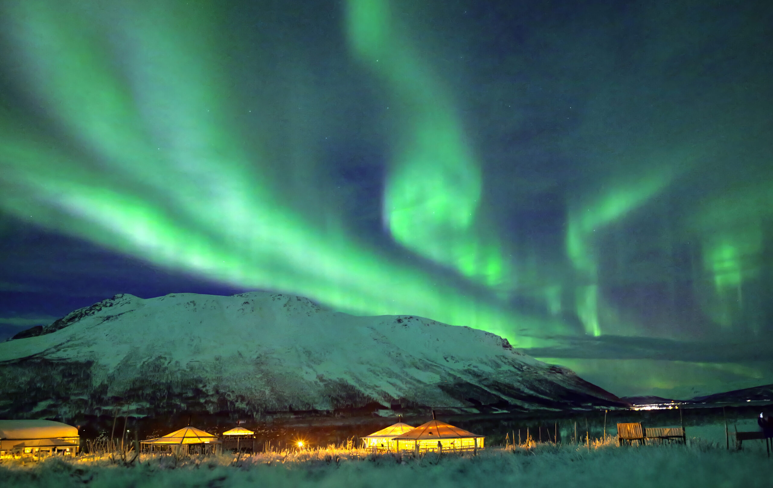 In unserer Region entwickelte sich das Polarlicht ungefähr ab 23:00 Uhr, wobei der Neumond und der klare Himmel ideale Beobachtungsbedingungen schufen. Gegen Mitternacht waren in Richtung Norden eher grüne, im Nordosten rote bis violette Himmelslichter zu sehen – anders aber als in Lappland „tanzten“ sie nicht am Himmel. Das mag daran liegen, dass sich der Teilchenstrom diesmal kontinuierlicher Richtung Erde bewegte und es im irdischen Magnetfeld nicht so viele Verwirbelungen gab. Doch auch heute noch ist dieses in Aufruhr, so dass abends noch Polarlichter zu sehen sein könnten, wenn auch mehr in nördlicheren Regionen, ähnlich wie hier in einem Sami-Rentiercamp in der Nähe von Tromsø: