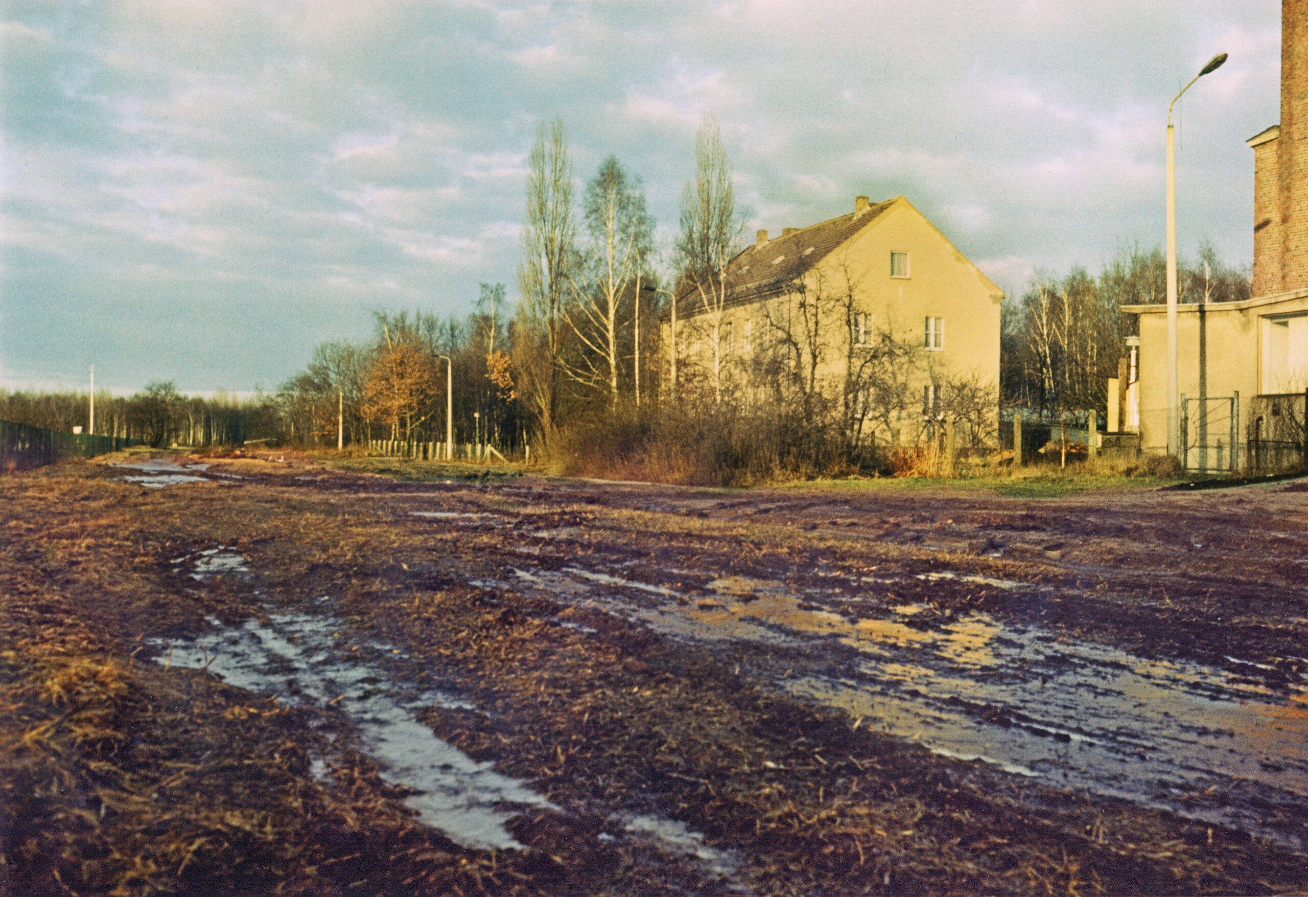 Über Jahrzehnte hinweg dokumentierte Lippold, wie sich der Ort wandelte. Etwa die Förster-Funke-Allee. „Es war ein furchtbarer Feldweg, der jedes Mal nach dem Regen vollkommen zermatscht war. Andererseits waren die Obstbäume und die Felder ringsherum traumhaft schön.“ Lippold achtete darauf, aus derselben Perspektive zu fotografieren – um Wandel sichtbar zu machen. Oft dienten Bäume als Fixpunkte, als stille Zeugen des beständigen Wechsels um sie herum. Nach dem Studium der Informationstechnik in Dresden kehrte er zurück nach Kleinmachnow, nahm eine Stelle im VEB Elektronische Bauelemente „Carl von Ossietzky“ in Teltow an – und fotografierte weiter. Der Arbeitsweg wurde zum Motiv, der Alltag zur Chronik. Mal in Farbe, mal in Schwarz-Weiß. Doch nichts veränderte den Ort so tiefgreifend wie die Wende. „In den Jahren davor hatte sich Kleinmachnow kaum gewandelt. Der ‚Konsum‘ war über Jahrzehnte am gleichen Ort, auch wenn die Geschäftsführer wechselten. Das Gleiche galt für die meisten anderen Läden. Dafür schien die Zeit nach der Wende in einem vollkommen neuen Tempo zu fließen. Fast über Nacht wandelte sich alles.“