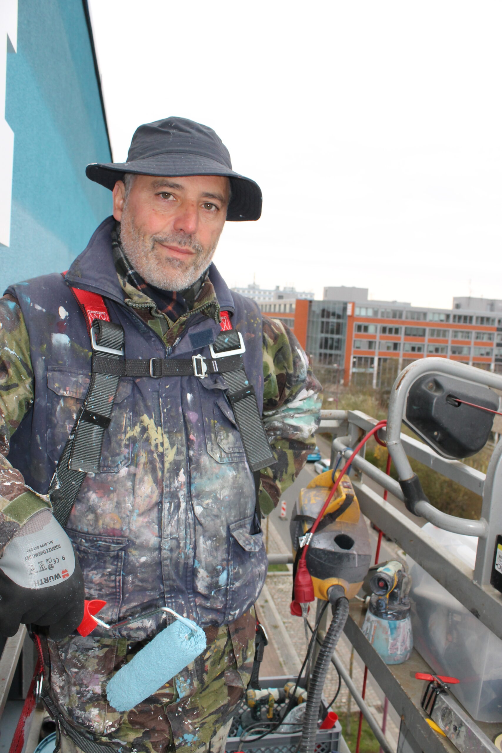 In Teltow gestaltet er gerade die Fassade des Gewerbestandorts THE FRAME Teltow – eines der modernsten und nachhaltigsten Gewerbeobjekte in Teltow in dem aktuell noch wenige verbleibende Flächen zur Vermietung zur Verfügung stehen. „In und um Berlin zu arbeiten ist für mich immer etwas besonderes“, erzählt Victor Ash. „In und um Berlin zu arbeiten, ist für mich immer etwas Besonderes“, erzählt Victor Ash. „Ich habe diesen urbanen Großraum stets als Inspiration empfunden. Ich finde es wunderschön, wie sich hier Kunst ins Stadtbild integriert. Für einen Künstler ist es ein wundervolles Gefühl, wenn seine Werke direkt auf der Straße vom Publikum entdeckt werden.“ Eine der Herausforderungen beim Teltower Projekt war es, die Fenster in das Endprodukt einzubinden. „Was ich hier gestalte, heißt ‚The Frame‘, genau wie das Gebäude. Die Farbe Blau soll natürlich auch eine Verbindung zum Teltowkanal und dem Element Wasser, welches diese Region prägt, darstellen.“ Auch übers Wochenende wird Victor Ash an seinem Werk arbeiten. Dass ihm dabei manchmal Schneeflocken um die Ohren wehen, stört ihn nicht sonderlich. „Als Street-Art-Künstler muss man einiges aushalten. Genau diese Art zu arbeiten zeichnet den Unterschied zum Arbeiten in einem Atelier aus.“