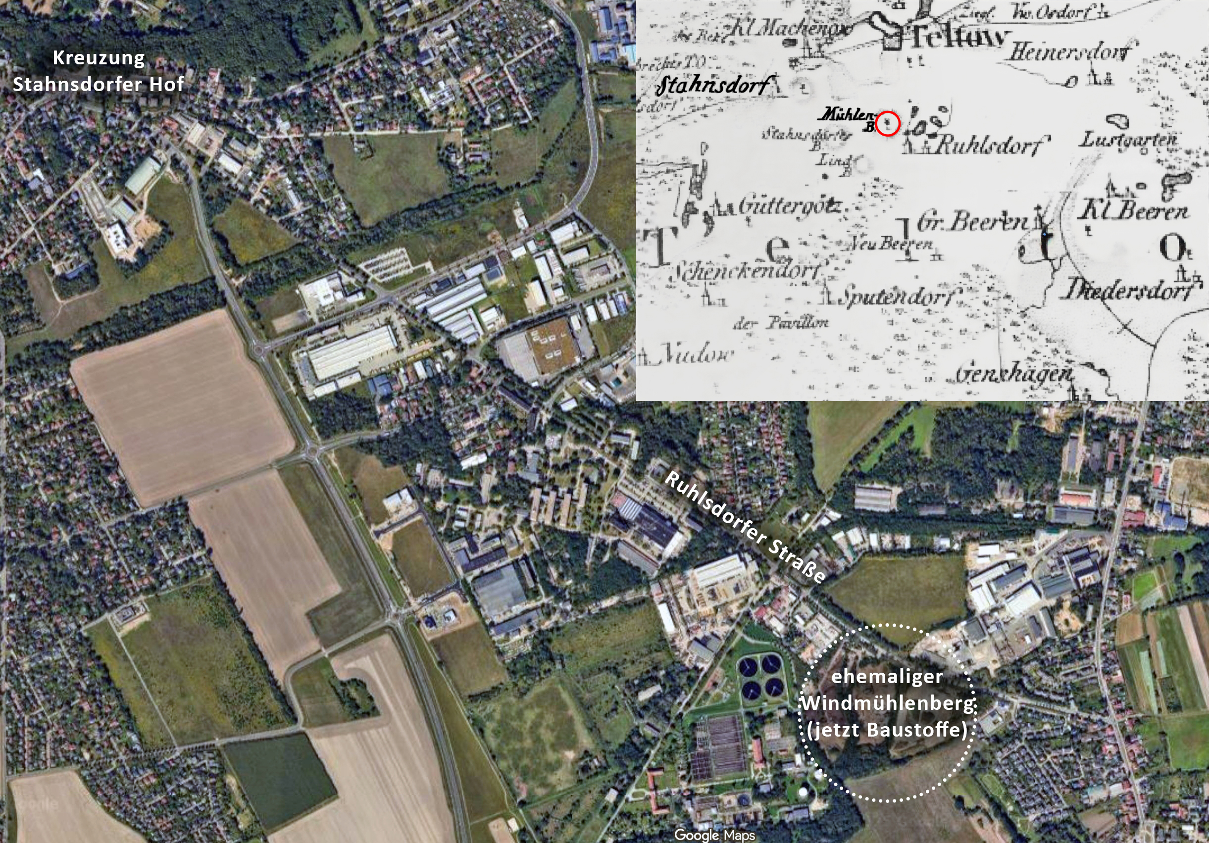 Der ehemals 60 Meter hohe Windmühlenberg ist nahezu vollständig abgetragen. Wenn man vom Kreisverkehr aus in Richtung Ruhlsdorf fährt, fällt nur noch ein flacher Hügel auf. Dort haben sich Baustofffirmen niedergelassen, und die noch vorhandenen Steine, die von der Errichtung des Teltowkanals übrigblieben, wurden als Baumaterial verkauft. Bagger haben das Gelände eingeebnet, sodass glatte Lagerflächen entstanden sind. Hier wie auch an den anderen ehemaligen Fundstellen von Zeugnissen der megalithischen Kultur gibt es weder Informationstafeln noch sonstige Hinweise. Der ehemalige Bundespräsident Richard von Weizsäcker hätte sich wohl dafür eingesetzt, die Relikte unserer fernen Vorfahren in irgendeiner Form zu würdigen: „Wer vor der Vergangenheit die Augen verschließt, wird blind für die Gegenwart.“