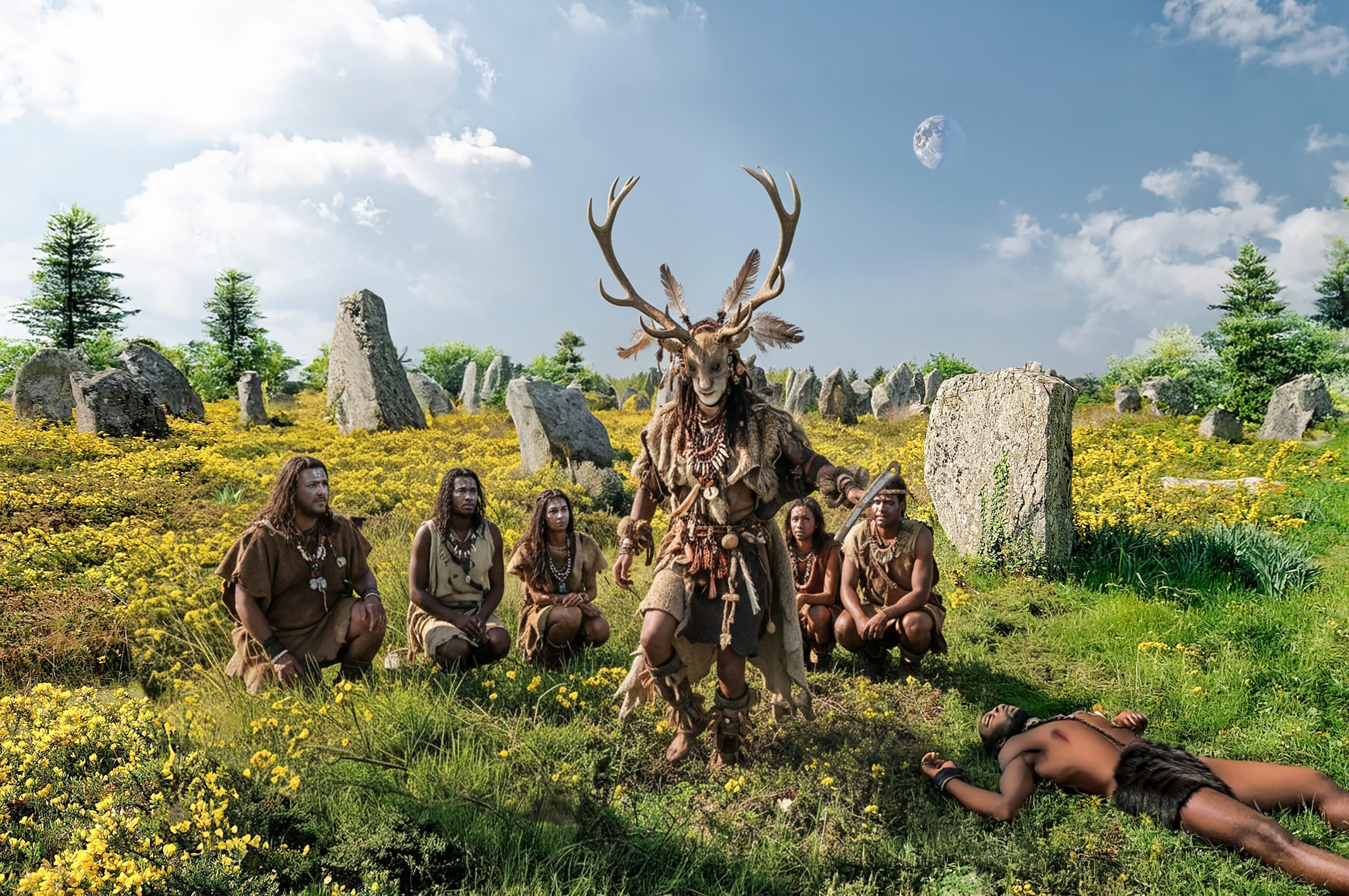 platz, in dessen Nähe sich auch ein Großsteingrab befindet, ein Heilungsritual statt. Wie man solche Steinbauten errichtet, hatten die Vorfahren aus dem heute türkischen Göbekli Tepe schon vor 12.000 Jahren gewusst. Menschen aus den Siedlungen nördlich und südlich des Flusses haben sich heute eingefunden, damit der Schamane Luv einen verletzten Jäger vom bösen Fluch des Bären, der ihn angegriffen hat, befreien kann. Luv stammt aus dem Norden und ist hellhäutiger als die anderen Teilnehmer, die eine dunkle Hautfarbe und blaue Augen haben. Er erschien plötzlich während eines heftigen Gewitters, der Sturm hatte seinen Einbaum ans Ufer gedrückt, die Ruder waren zerbrochen. Dann wurde er vom hiesigen Stamm aufgenommen, der seine Ankunft als göttliche Fügung betrachtete. Es dauerte einige Monde, bis er ihre Sprache beherrschte, aber er kannte wundersame Rituale, schien magische Kräfte zu besitzen und konnte sogar den Zeitpunkt von Himmelsereignissen wie die Anzahl der Tage zwischen den Mondphasen genau vorhersagen. Dabei benutzt er einen Zauberstab aus Hirschgeweih, auf dem rätselhafte Kerben und Zacken eingeritzt sind, und die Peilung durch ein Loch ermöglicht ihm die Bestimmung der Mondgröße. Bei Ritualen bemalt Luv sein Gesicht mit weißem Schlamm und trägt eine Hirschgeweih-Maske, Federschmuck und Ketten aus Schneckenhäusern. Für die Bewohner der Gegend ist die Maske nichts Ungewöhnliches, wurden doch Hirschgeweihe bereits von ihren Vorfahren als heilig verehrt. Leder- und Fellkleidung tragen alle, denn inzwischen haben sich die Temperaturen wieder etwas abgekühlt – doch spätere Generationen werden auch wieder Warmphasen erleben. Ob es dem Schamanen Luv gelingt, den Verletzten zu heilen, wissen wir nicht – sein Zauberstab aus Hirschgeweih wird jedoch viele Jahrtausende überdauern.