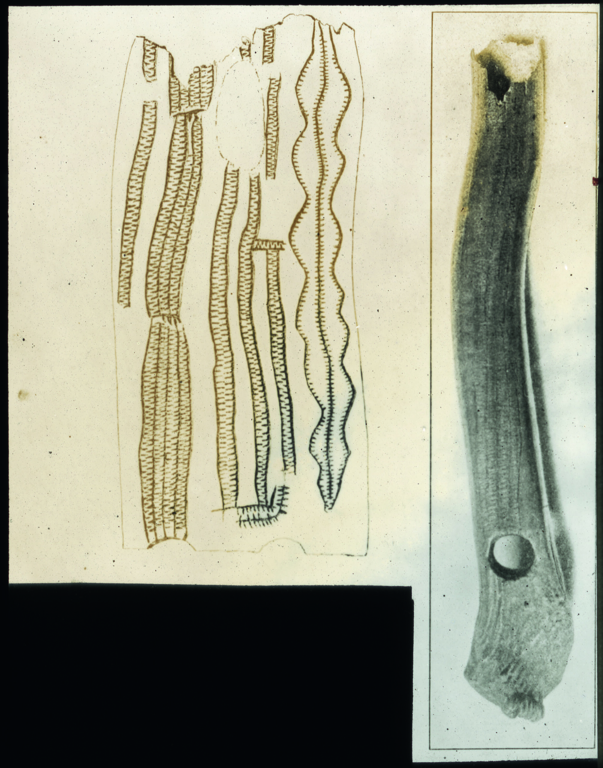1904 / 1905 graben sich im Bäketal an der zukünftigen Schleuse Hunderte von Arbeitern immer tiefer vor und stoßen dabei auf einige merkwürdige Gegenstände: kurze Pfeilspitzen aus Stein, harpunenähnlich geschnitzte Knochen, eine Knochenaxt („Tüllenaxt“) und – auf der Kleinmachnower Seite – einen Stab aus Hirschgeweih mit Einritzungen, den man an Georg von Hake übergibt. Dessen Schwager ist Anthropologe und erkennt die Bedeutung des Fundes. Man fertigt sogar eine Kopie des Stabes an, die in der „Gaststätte zum Schleusengarten“ ausgestellt wird – beide Exponate gehen jedoch leider während des Zweiten Weltkriegs verloren. Offenbar wurden sogar Menschen- und Pferdeknochen gefunden – auch diese sind spurlos verschwunden. Schade: Mit heutigen Analysetechniken könnte man so viel darüber herausfinden. Zum Kleinmachnower Hirschgeweihstab gibt es übrigens Vergleichsobjekte aus Dänemark und von der deutschen Ostseeküste, 2021 wurde deren archäoastronomische Bedeutung als Mondkalender nachgewiesen.