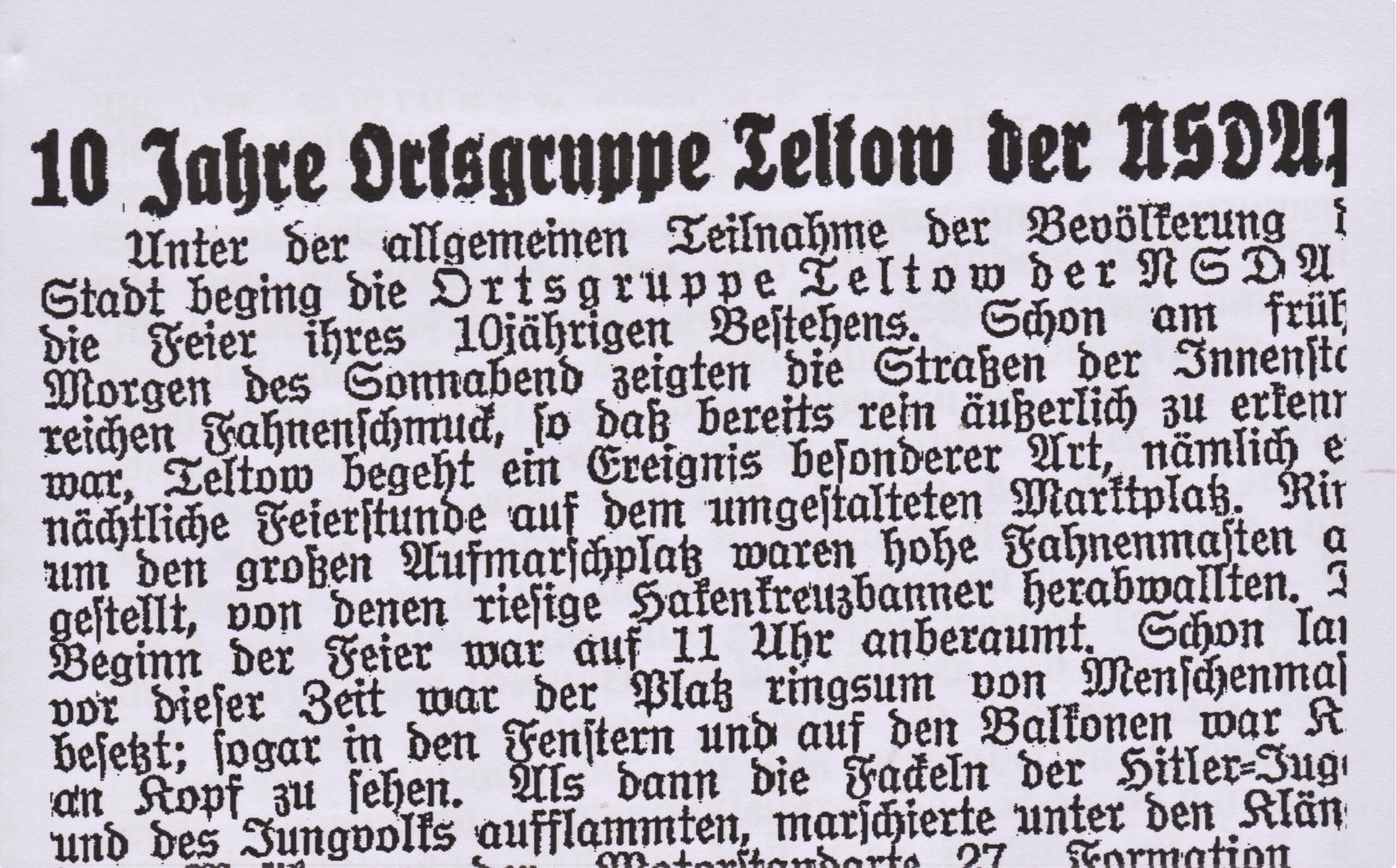 Am 11. November erscheint im BeBra Verlag das Buch „Bereitwillig mitgemacht“? – Teltow im Nationalsozialismus 1933-1945 – Herausgeber Gabriele Bergner. Dieses Buch beleuchtet zum ersten Mal die Stadtgeschichte in den Jahren 1933 bis 1945. Trotz einer schwierigen Quellenlage gelang es auf Basis einer über zehnjährigen Recherchearbeit, einen Überblick über Strukturen, Entwicklungen und handelnde Personen zu erarbeiten. Ein Gastbeitrag von Jens Leder.