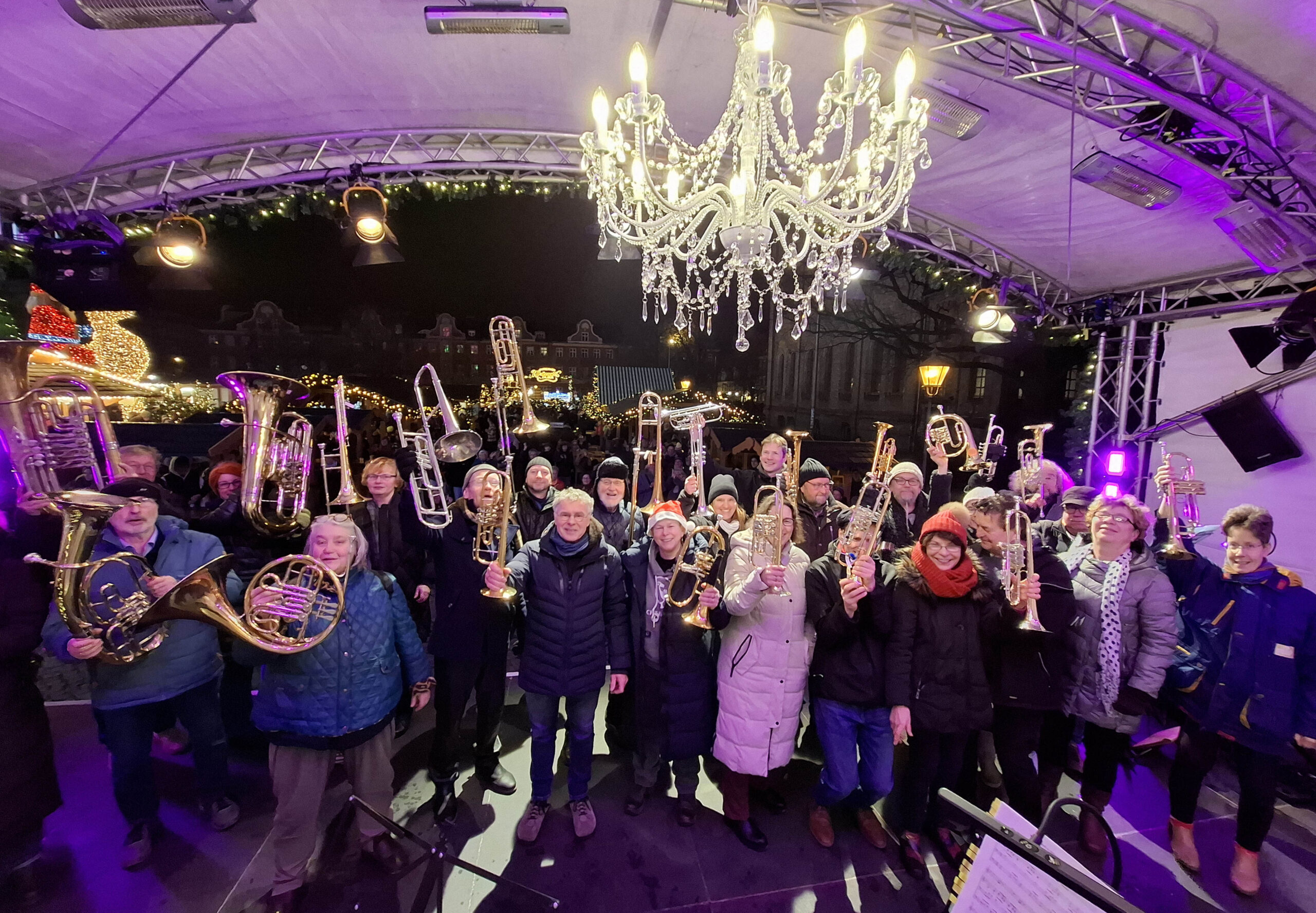Der Kreisposaunenchor Potsdam spielt auf den Stufen der St. Nikolaikirche Potsdam