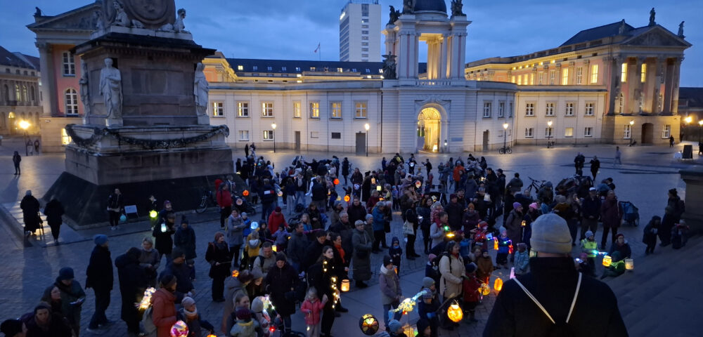 Höhepunkt des Tages ist das Laternen-Treffen um 16:30 Uhr auf dem Alten Markt. In winterlicher Atmosphäre mit Feuerschale musiziert der Kreisposaunenchor Potsdam auf den Stufen der St. Nikolaikirche und lädt mit Laternen- und Abendliedern zum Mitsingen und Mitschunkeln ein. Den Abschluss bilden um 17:15 Uhr eine kostenfreie Taschenlampenführung in der St. Nikolaikirche sowie um 18:00 Uhr eine Interreligiöse Abschlussandacht mit Gemeindepädagogin Anna Bräutigam. Das Café Central sorgt von 15 bis 18:00 Uhr für kulinarische Angebote.