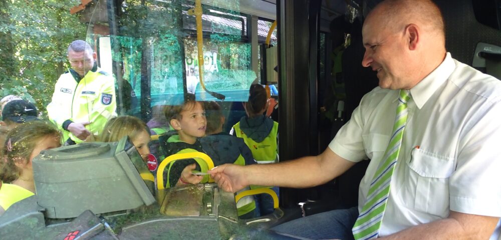 Draußen zeigen Juliane Mutschischk und ihr Kollege Matthias Näpfli (Polizeiobermeister) den Kleinen, wie wenig sie vor und hinter dem Bus von anderen gesehen werden. Dann geht’s auf den Weg über die Straße – wieder mit dem sichernden Blick nach Links und Rechts. Alle meistern dies tadellos und erhalten eine „Goldmünze“ von Herrn Näpfli. Mit dieser können sie im Bus eine Fahrkarte beim Fahrer Maik Brüggemann kaufen und lernen, wie man den Entwerter nutzt.
