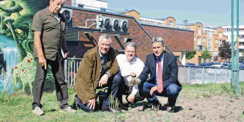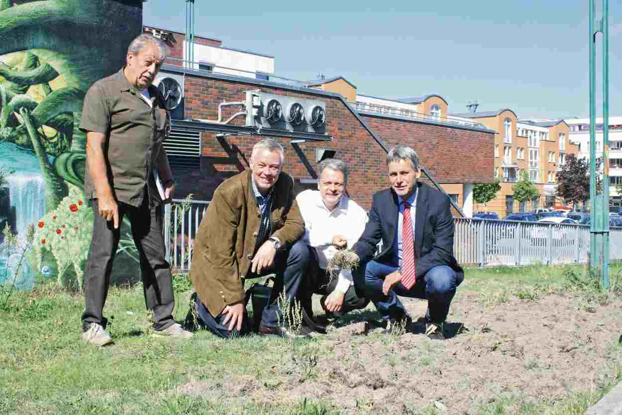 Die Jagdpächter Jörg Fenske und Peter Hemmerden sowie die Bürgermeister Bernd Albers und Michael Grubert (von links) begutachten den Wildschweinschaden am Rathausmarkt.