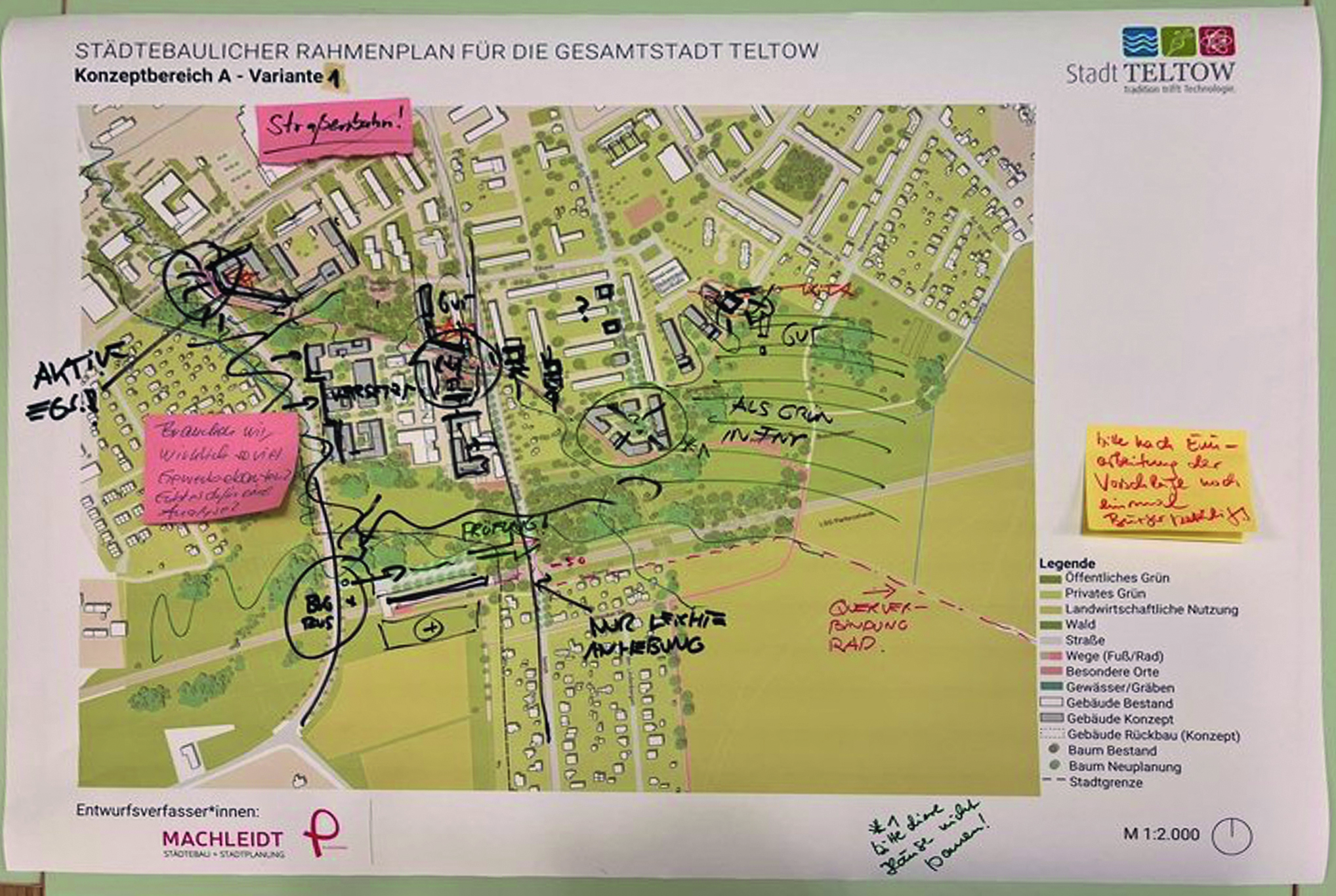 2004 hatte die Stadt Teltow einen rechtskräftigen Flächennutzungsplan (FNP) vorgelegt, der die Grundlage für weitere bauliche Planungsprozesse bildet. Da dieser ein sehr langfristiges Planungsinstrument ist, kann er bei veränderten Rahmenbedingungen neuen Anforderungen und Erfordernissen angepasst und weiterentwickelt werden. Dies ist mit dem Entwurf eines städtebaulichen Rahmenplans inhaltlich vorbereitet worden, der im Januar letzten Jahres in einer Bürgerversammlung vorgestellt und diskutiert werden konnte. Die endgültige Entscheidung liegt indes bei den Stadtverordneten.