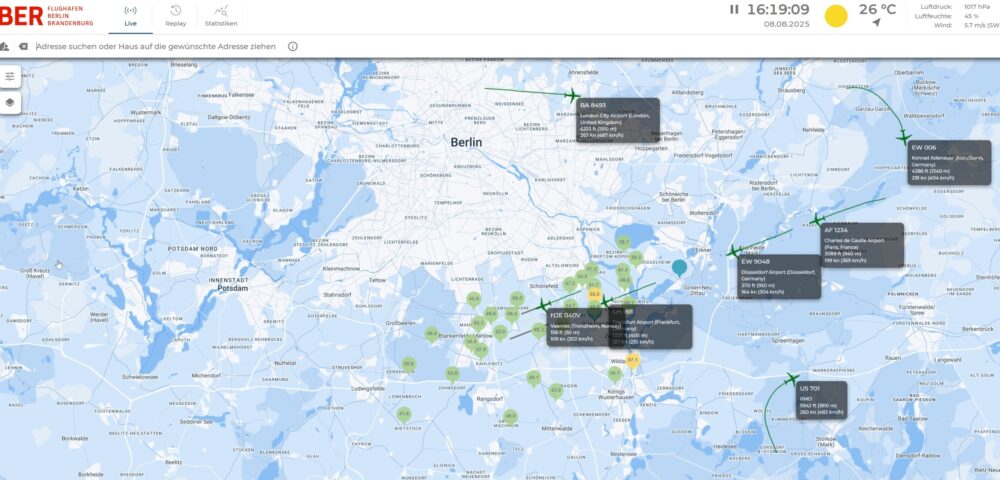 Foto: Flugrouten aktuell/ Screenshot vom Flughafen BER