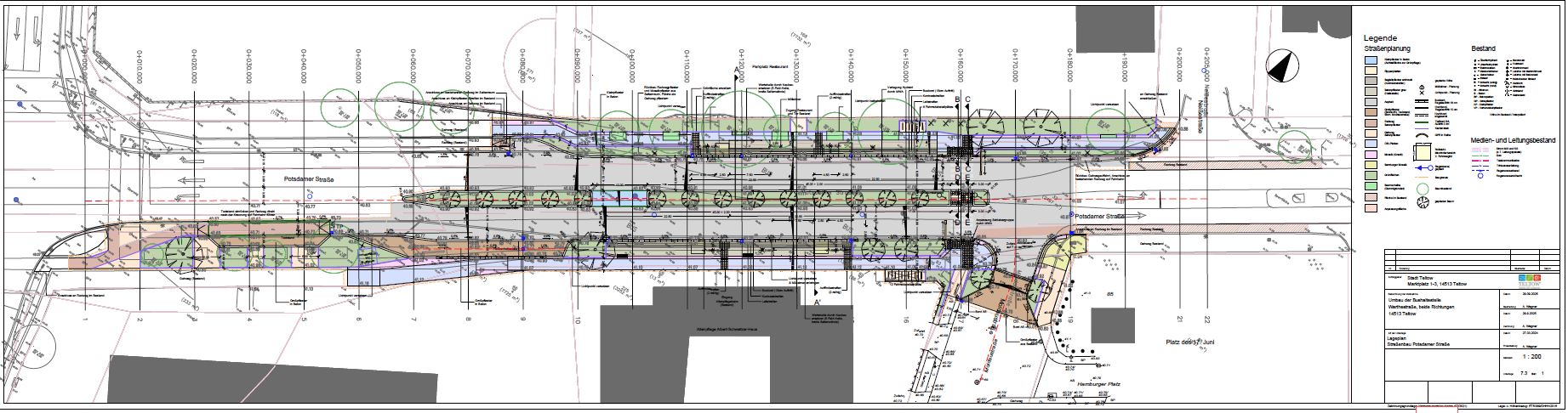 Vor dem Gesundheitszentrum an der Potsdamer Straße werden die beiden Haltestellen erneuert. Die Bauarbeiten dauern vom 10.November bis zum 30.4.2026. Geplant sind zwei neue Wartehäuschen. Außerdem soll zur Verbesserung der Überquerung der Potsdamer Straße eine Mittelinsel errichtet werden.