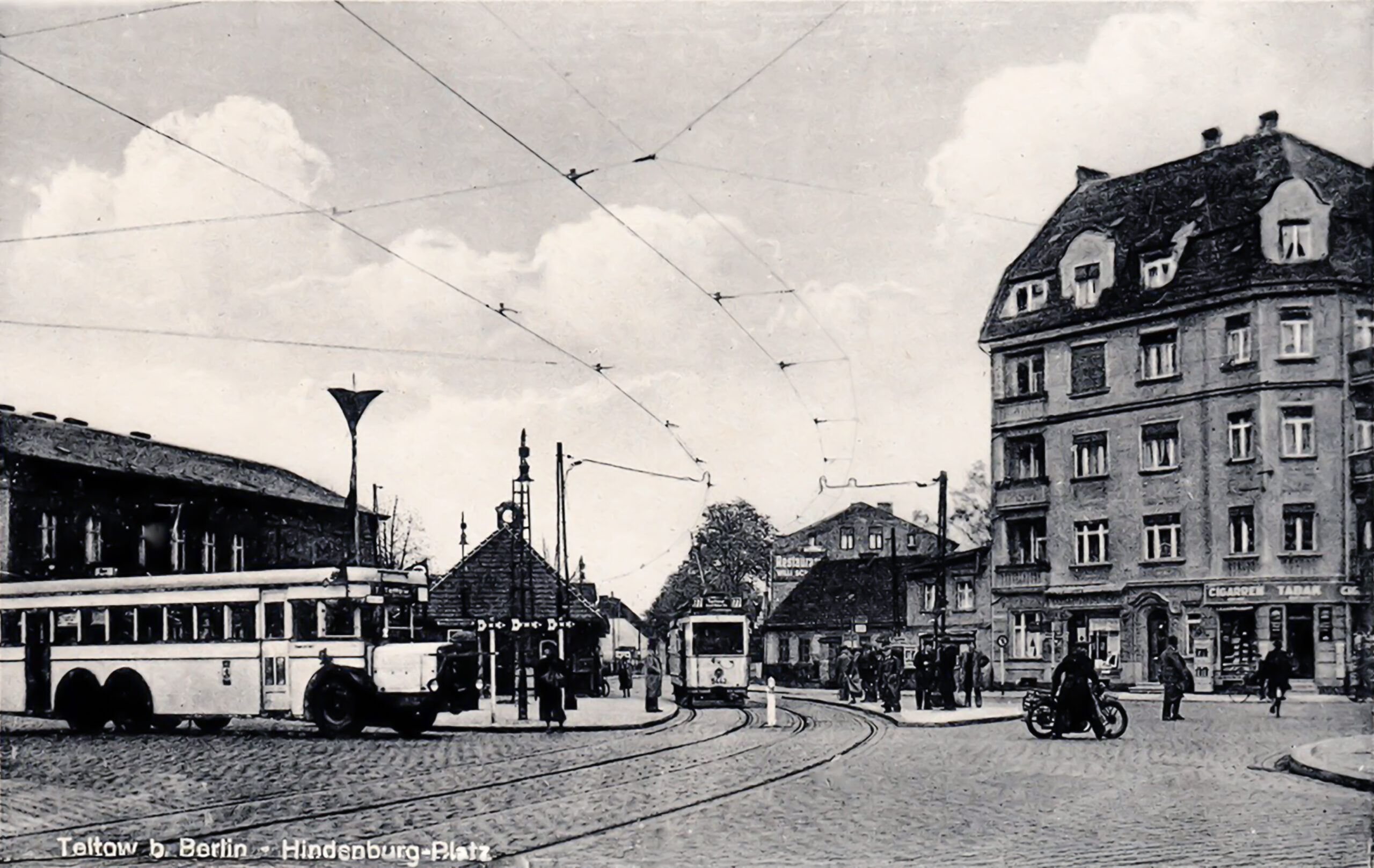 1945 war jeglicher öffentliche Personenverkehr in Teltow zusammengebrochen. Die Straßenbahn fuhr noch bis etwa 20. April 1945, die beiden letzten in Teltow befindlichen Straßenbahnwagen wurden auf dem Ruhlsdorfer Platz zusammengeschossen. Nach der Reparatur der teilweise beschädigten Gleise und der Wiederinstallation der Fahrleitung wurde der Straßenbahnverkehr im Februar 1946 wieder aufgenommen, zunächst durchgehend bis Tempelhof … später dann als Teilstrecke zwischen Seehof, Paul-Gerhardt-Straße und Machnower Schleuse mit Übergangsmöglichkeit von Seehof nach Lichterfelde Süd, Schwelmer Straße, wo die »West 96« einsetzte. Am 31. Oktober 1961 kam der Straßenbahnverkehr als Folge der Grenzschließung endgültig zum Erliegen; von da an übernahmen Omnibusse den Betrieb.“